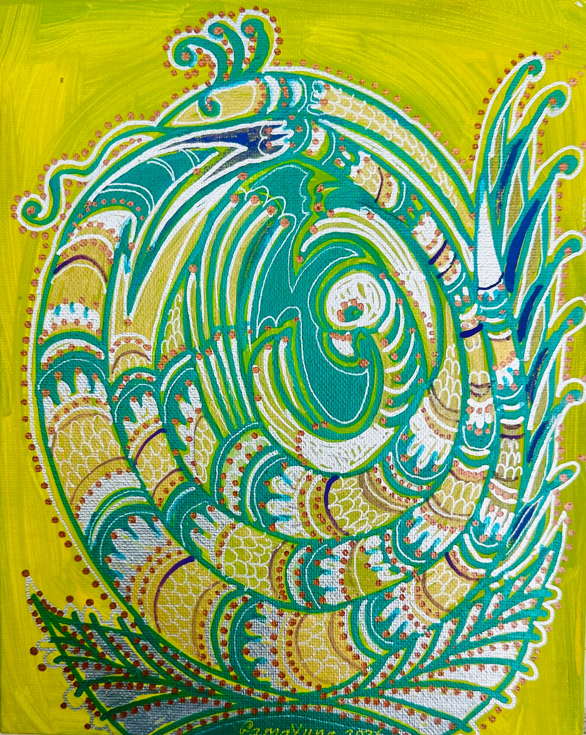 GamaYuna is the mystical bird, flying between worlds and bringing sacred knowledge from higher realms to this earth. Through art, these divine messages are translated into visual form—colors, symbols, and sacred geometry that speak directly to the soul.